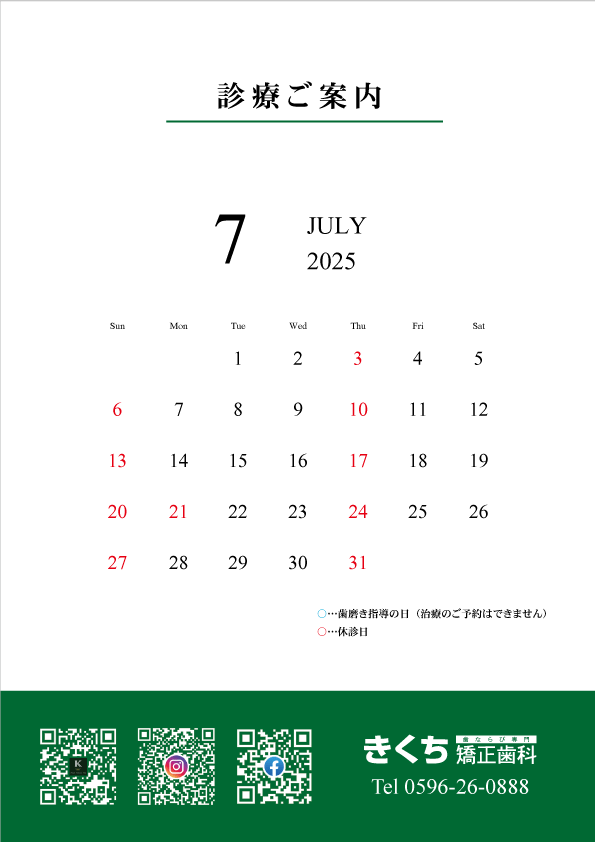こんにちは😊2025年7月の診療案内です🪥ご予約の参…