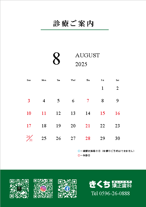 こんにちは😆2025年8月の診療案内です🦷ご予約の参…