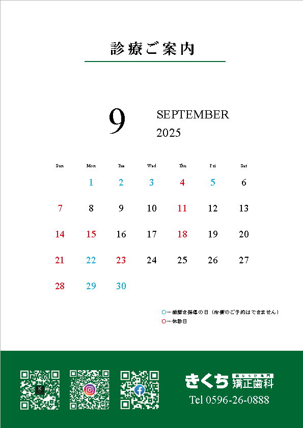 こんにちは😃2025年9月の診療案内です🦷ご予約の参…