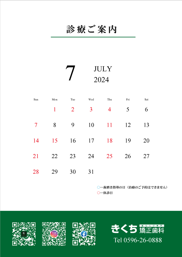 こんにちは😄2024年7月の診療案内です🦷ご予約の参…