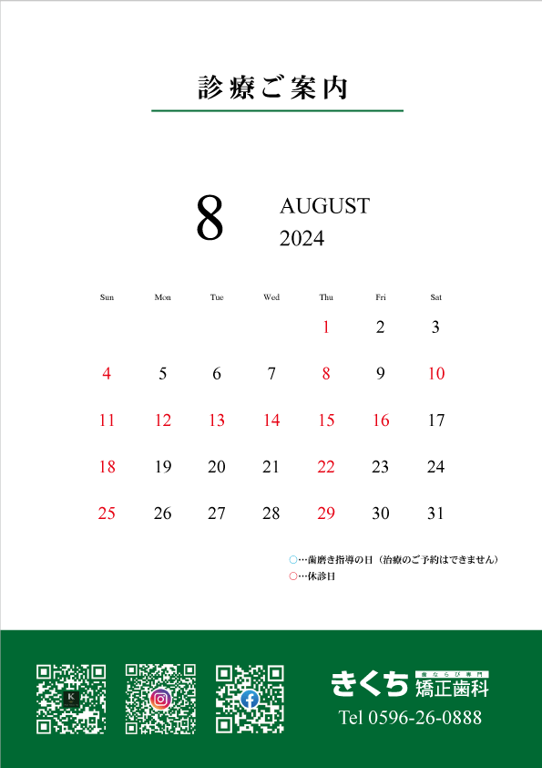 こんにちは😁2024年8月の診療案内です💡ご予約の参…