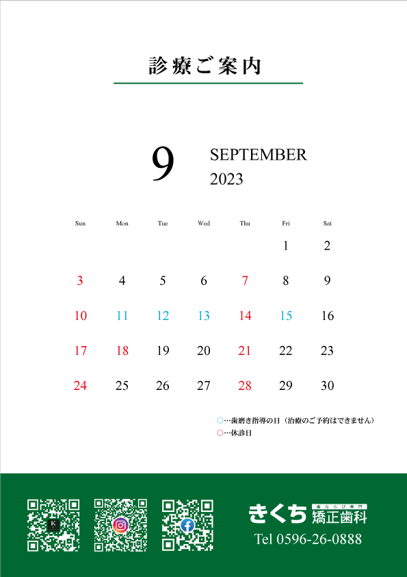 こんにちは😉2023年9月の診療案内です🦷ご予約の参…