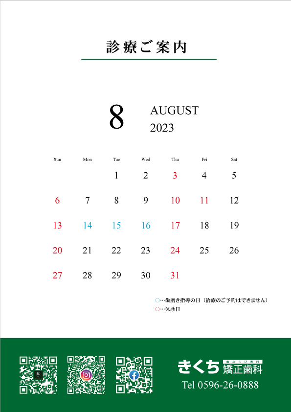 こんにちは😊2023年8月の診療案内です🦷ご予約の参…