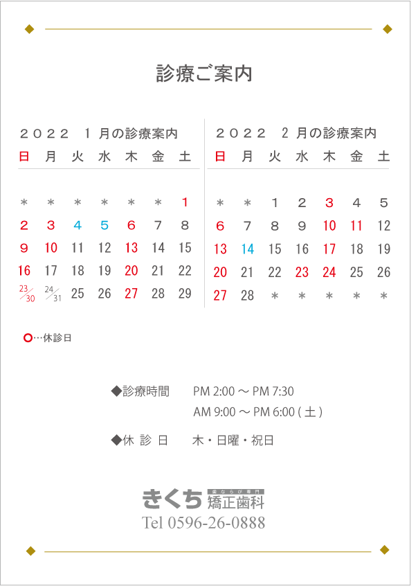 こんにちは?2022年1月、2月の診療案内です。ご予…