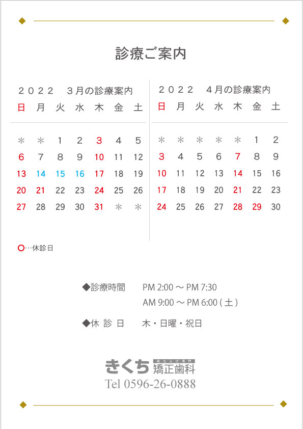 こんにちは?2022年3月、4月の診療案内です?ご予…