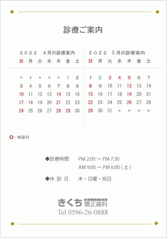 こんにちは?2022年4月、5月の診療案内です ❕ご…